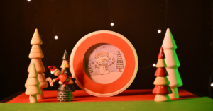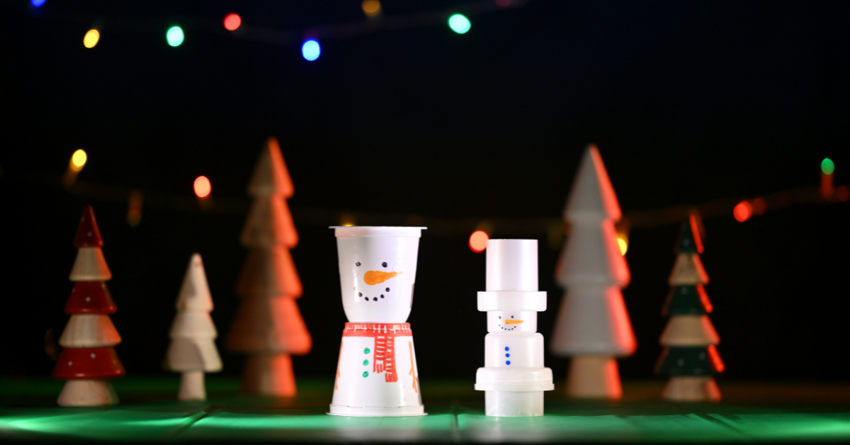 Buca i due vasetti dello yogurt. Collega i due vasetti con un elastico in modo che rimanga in tensione e i due vasetti quando tirati producano un “bel calck”. Disegna il volto di Frosty